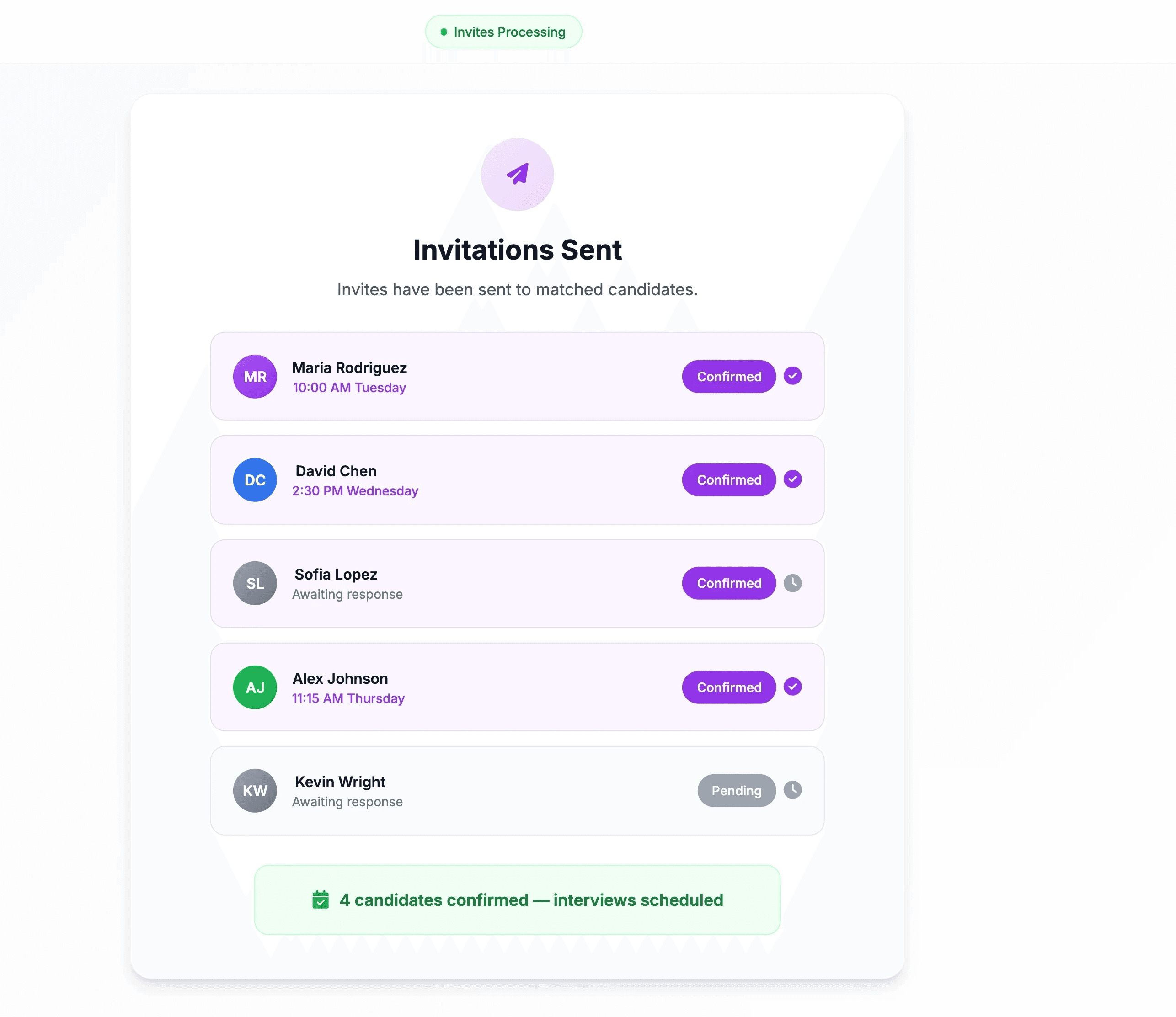 No applicant piles. No sorting. You start with scheduled interviews from candidates who already qualify.